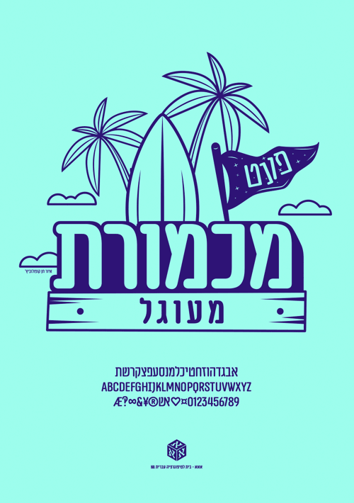 Conceived from the old entrance sign to the village of Mikhmoret, the Mikhmoret typeface continued to grow while drawing inspiration from classical Hebrew fonts such as Aharoni and the wooden type blocks of the 1940’s. -