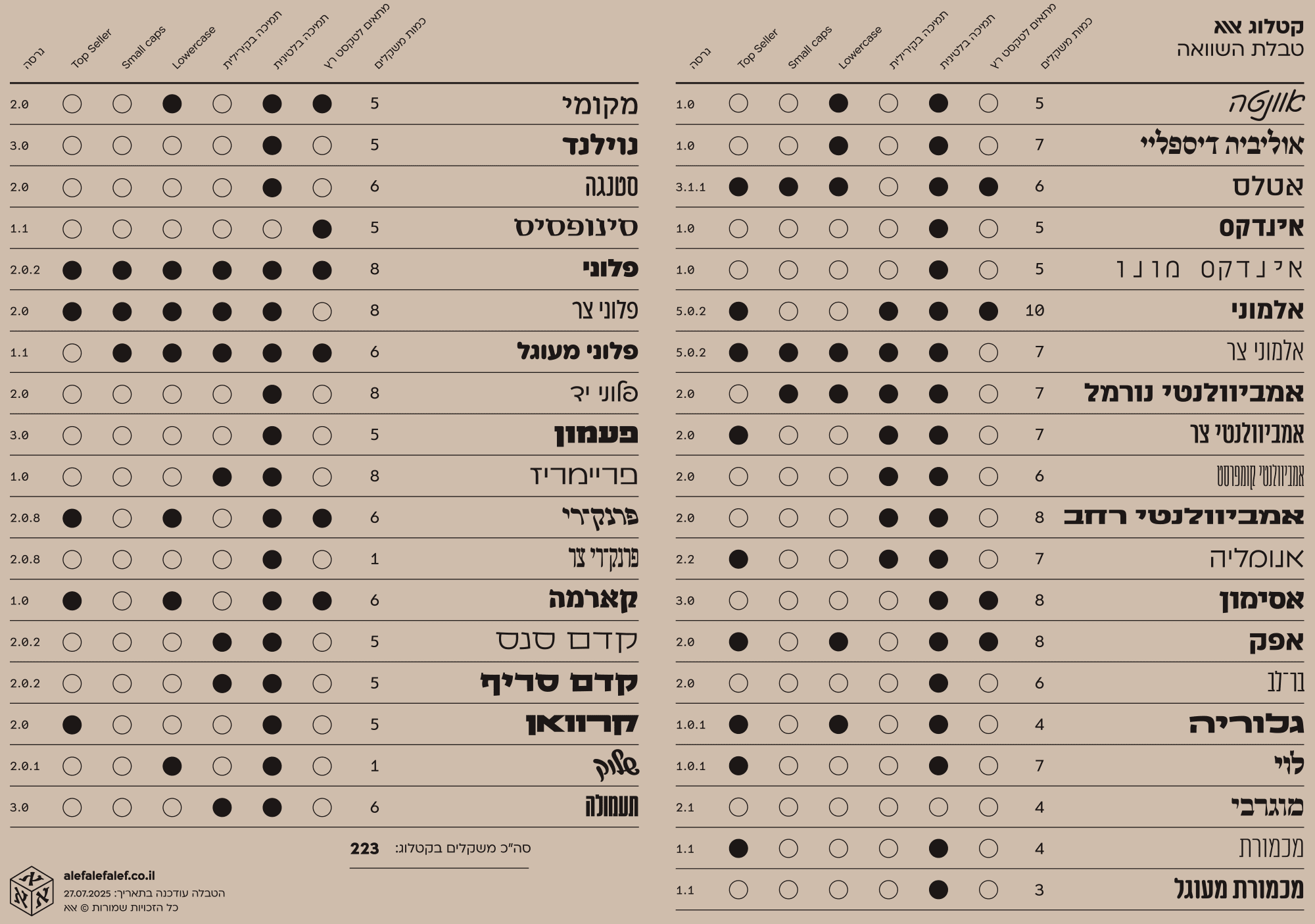 - מינוי ״ריסלר״ כולל את כל הפונטים בקטלוג אאא ואת כל החדשים שיצאו במהלך המינוי (אנחנו משיקים 2 פונטים חדשים בשנה בממוצע).