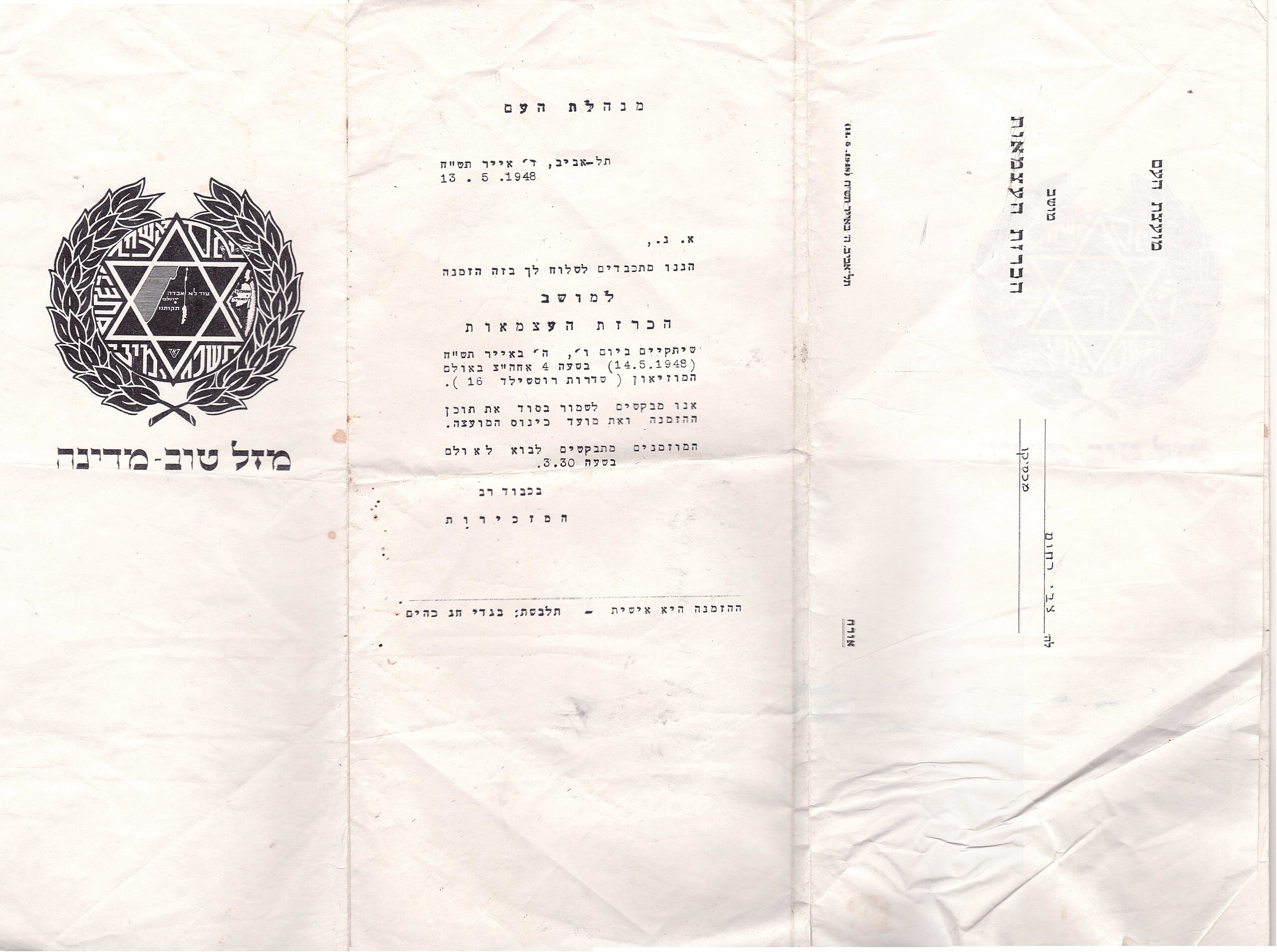 הזמנה להכרזת העצמאות מעוטרת בגופן ״סתם״ של פרנציסקה ברוך. תמונה באדיבות Ran Rachum תחת רישיון CC BY-SA 4.0.