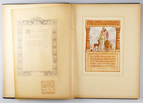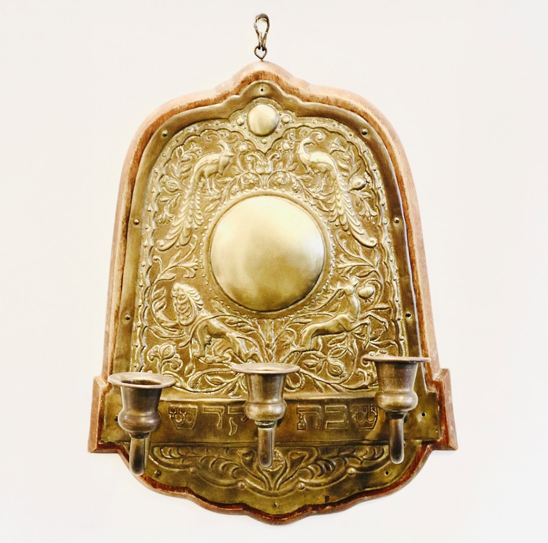 4. מעמד פמוטים עבור נרות שבת – פריט יודאיקה (מוערך בין 1912-1930) – תלוי על הקיר ממול למזנון. מבט מקרוב מגלה את עושר הפרטים והסימבולים הטמונים בו. העיצוב הזורם והצמחי בסגנון אר-נובו מאפיין את רבן ומשלב סימבולים רבים – צמד טווסים, איילה ואריה, רימונים. הטיפוגרפיה ריבועית וכבדה, אופיינית לסגנון האשכנזי באותה תקופה, אגב גם ביצירותיו של אפרים משה ליליאן. עיגול קטן וכמעט נסתר בתחתית המעמד, ובו רשום ״בצלאל ירושלם״.