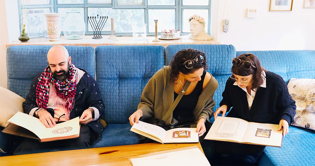 בסוף ההרצאה היא ניגשה אלי בשקט. ״נעים מאוד, אני מלי. דיברת הרבה על ההשראה ליצירה שאת שואבת מהאמן זאב רבן. אני גרה בביתו, נכדו היה בעלי, ז״ל. בואי לביקור.״ מפגש מקרי הביא למפגש גדול בהרבה. מפגש נדיר עם יצירות של מאסטר שעסק בקודש ובחול, וחיפש כל העת את העיצוב המקומי, הארצישראלי. כך, בתום סדרת הרצאות בה סיפרתי למשתתפים על איור ועיצוב בהשראה היסטורית, קיבלתי הזמנה אישית (או זימון, אם תרצו) לביתו של המאסטר שהשפיע על דרכי האמנותית – האמן, המעצב, הסימבוליסט והיוצר, זאב רבן (1890-1970). בילדותי, הייתי מורידה את אחד מהספרים הכבדים מהמדף, ובו כְּתוּבוֹת, איורים, צילומי דלתות נחושת ותבליטי אבן. יצירתו של רבן היא חלק מהרפרטואר האמנותי אליו נחשפתי מגיל צעיר. אותה גירסא דינקותא ממשיכה איתי הלאה. כרזת ״קדם״, בולי ״מפגשים של שלום״, בולי ״מועדים״, מהדהדים השראה זו. לעיתים חולפת בי המחשבה, שאולי הייתי שם מתישהו אצלו בסטודיו. והנה התגלגלה אלי הזמנה לביתו.