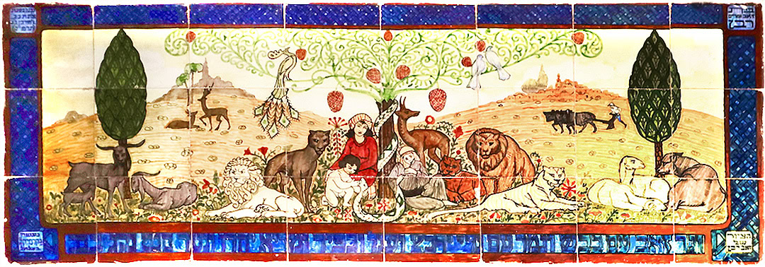 2. ״וגר זאב עם כבש ונמר עם גדי ירבץ״ (1930-1939) – במבואת הכניסה מקבלת את פני הבאים יצירת אריחי קרמיקה - ״וגר זאב עם כבש ונעים עם גדי ירבץ״ (ישעיהו יא׳, ו׳). היצירה ממוקמת על הקורה המרכזית של משקוף הכניסה, ובכך מאלצת את המתבונן להרים את המבט, אולי הצעה לראות רחוק לעבר עתיד אוטופי. היצירה מחולקת ל-3 חלקים, מבלי להיות טריפטיך רשמי. בחלק המרכזי היצירה מתארת זוג וילד, המוקפים בבעלי חיים שונים, אריות, נמרים, כבשים, איילות, נחש הנכרך סביב עץ (הדעת?) במרכז היצירה. זוג יונים וטווס (מוטיב חוזר ביצירות רבן) אף הם ממוקמים על העץ. בחלקה הימני של היצירה נראה חקלאי יהודי חורש את האדמה (אולי תזכורת לגלויה המפורסמת שאייר א״מ ליליאן לקונגרס הציוני ה־5). החלק השמאלי מתאר זוג איילים. באופק קו רקיע של שתי ערים, משמאל בולט מגדל. ייתכן ומייצג את מגדל דוד, עוד מוטיב נפוץ באמנות בצלאל הישן. ורסיה נוספת ליצירת קרמיקה זו בכתבה של ירונימוס אודות האריחים של רבן.