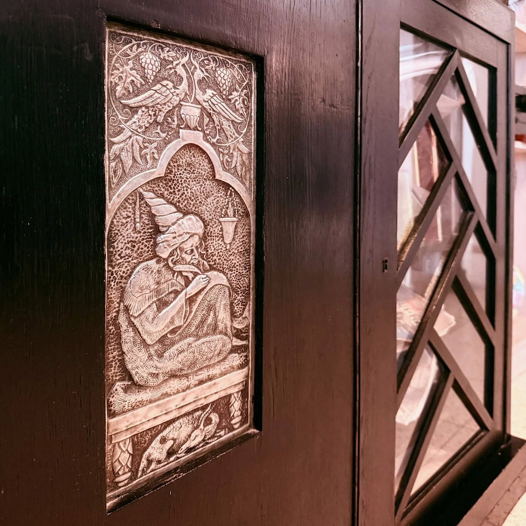 3. בסלון הבית, מזנון עץ כבד ומרשים. במרכז המזנון, תבליט נחושת. עליו דמות מסוגננת באופן מזרחי, בעלת כובע מחודד ופאות לחיים מסולסלות. היא ישובה על שרפרף, ותחתיו – איילה. הדמות ממוסגרת בחלון בסגנון אוריינטלי, וצמד טווסים יחד עם גפנים משתרגות מעליו. אולי עיצוב הדמות קשור לרושם העז שהותירו על רבן בני הקהילה התימנית, אשר נידמו בעיניו כיהודים אותנטיים, לא גלותיים, יהודים השייכים למקום ולאדמה. יש האומרים על נקודת מבט זו, שיש בה מן האוריינטליזם – מבט מערבי שיש בו פליאה אך גם התנשאות על אורחות בני המזרח. על כל פנים, מוטיב בעלי החיים הסימבוליים, האיילה והטווסים, חוזר ביצירות רבות של רבן.