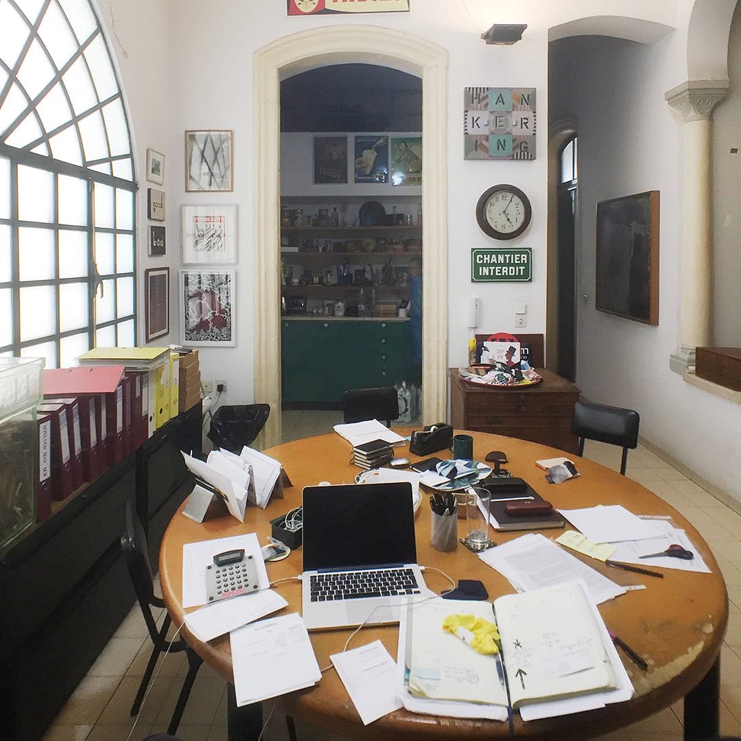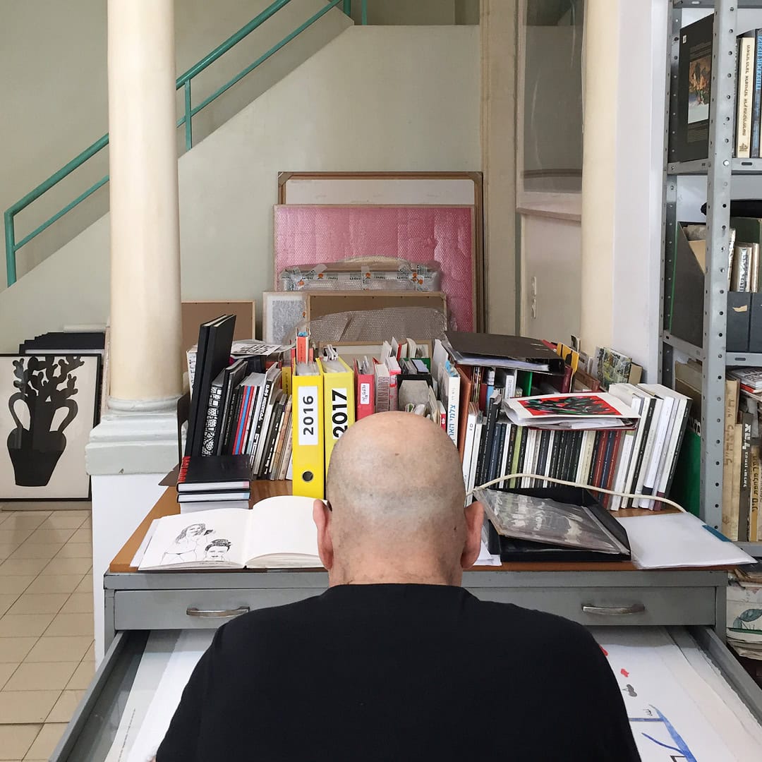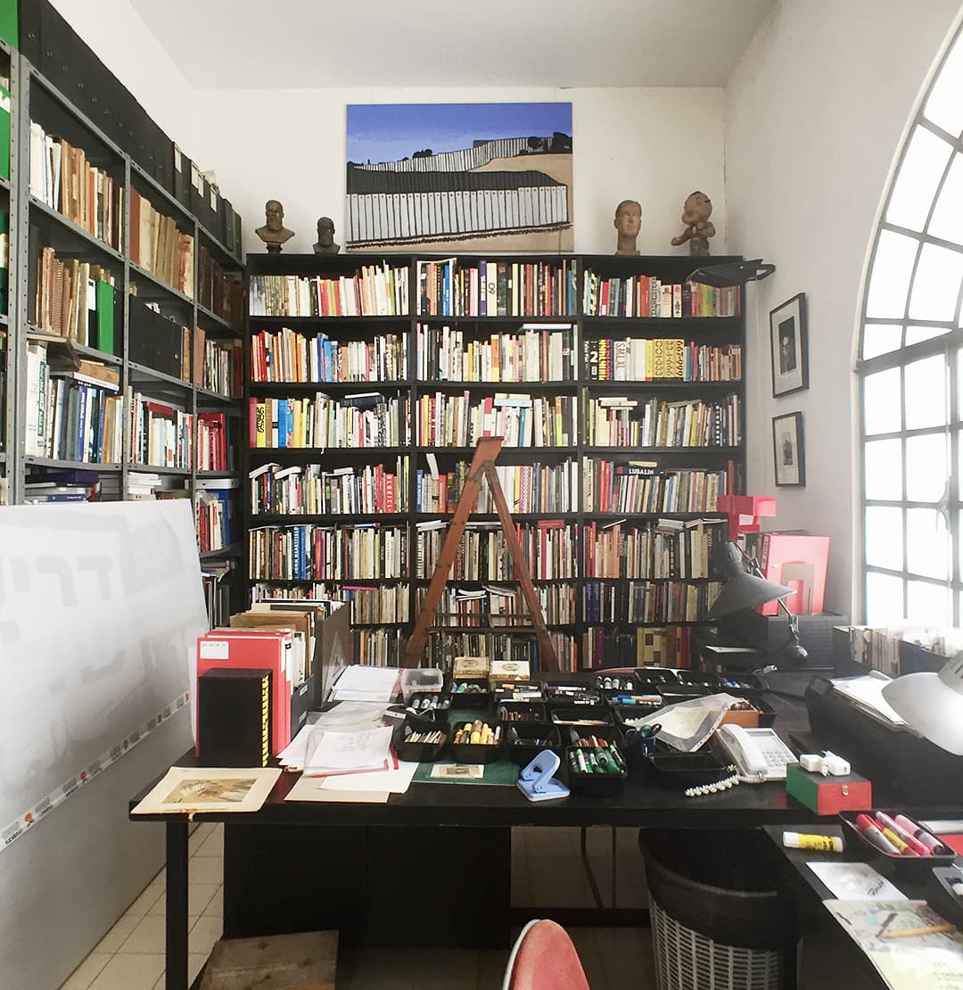 קירות הסטודיו מלאים במאות ספרי עיצוב ואמנות. על המדפים נערמו פריטי ׳ישראליאנה׳: אריזות מזון, משחקי קופסה, גלויות, דגלים, כרזות קולנוע. נדמה שדוד אסף כל פריט גרפי שנוצר בישראל מאז קום המדינה וכנראה שגם לפני שנוסדה. איך הוא עשה את זה? מגירות עמוסות בסיכות, מזכרות, מטבעות, מדבקות וקופסאות גפרורים; שלטי רחוב מצוירים ביד; כרזת ״גרפיקה שימושית״ של פרנץ קראוס; קקטוסים ופסלים; אותיות חיים ענקיות. במרכז החלל, על שולחן העבודה, היו מונחים טושים וכלי כתיבה, ולצדם מסודרות בשורה – המחברות השחורות המפורסמות: מחברות A4 בכריכה קשה שבהן רשם וצייר יום־יום במשך עשרות שנים ובהן הופיעו הקקטוסים שלו, פורטרטים של חברים, סצנות רחוב, והרבה מהנוף המשתנה של תל־אביב. פתחנו מגירות ודפדפנו במחברות.