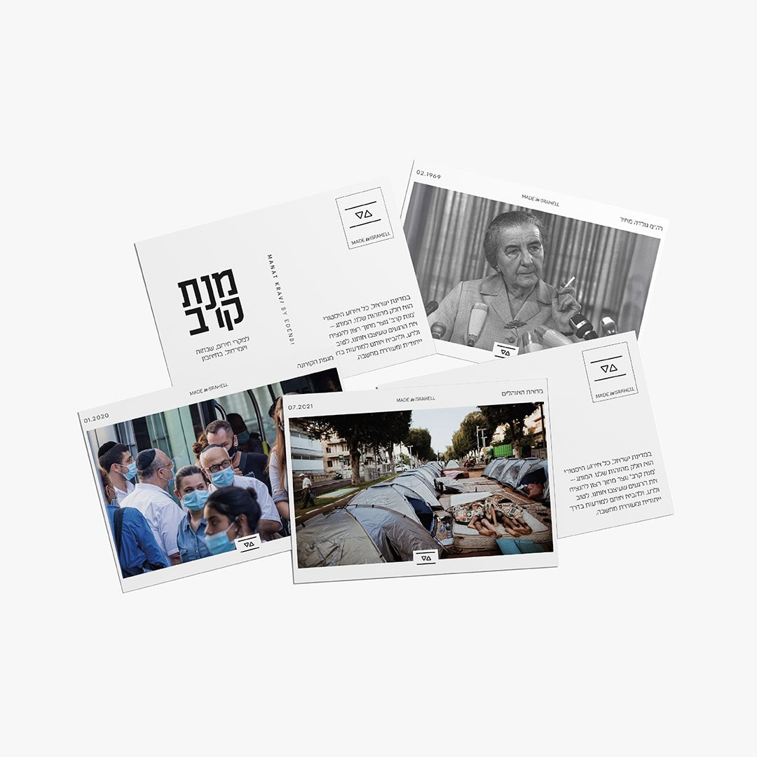 בפרויקט "מנת קרב", יצרתי שפה חזותית חדשה לסמלים של אירועים מכוננים בתולדות ישראל. שאבתי השראה מאריזות מזון ישראליות מתקופות שונות, וכך נולדו לוגואים שמדברים את השפה העיצובית של התקופה שבה התרחש כל אירוע. כל פריט שעיצבתי כולל גם מידע היסטורי, מתוך מטרה להנגיש את הסיפור הלאומי לדורות הבאים.